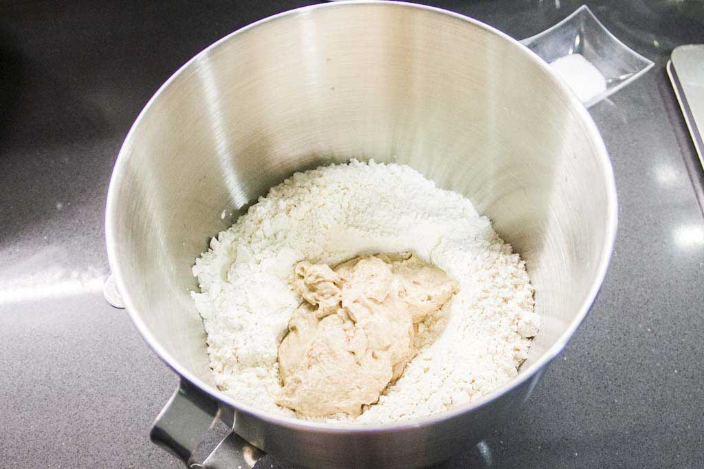 • En el bol de la Kitchen Aid vertemos toda la harina y hacemos hueco en el medio formando un volcán e introducimos en el centro la cantidad de masa madre.