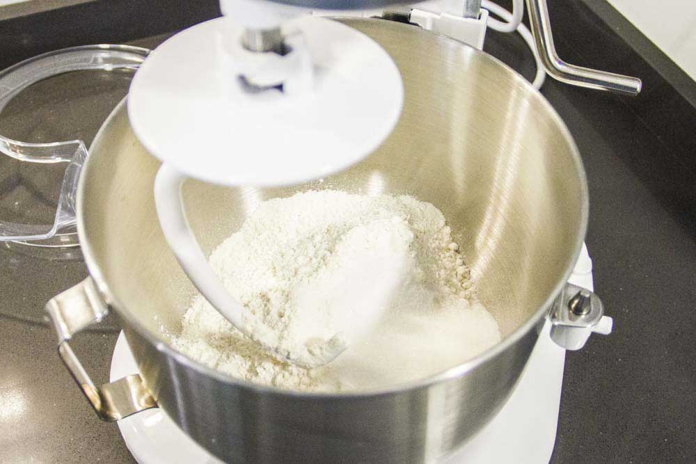 - Mezclar en un bol todos los sólidos, las dos harinas, la sal y el azúcar. Mezclar con una varilla o para facilitar el proceso utilizar una amasadora o KitchenAid.