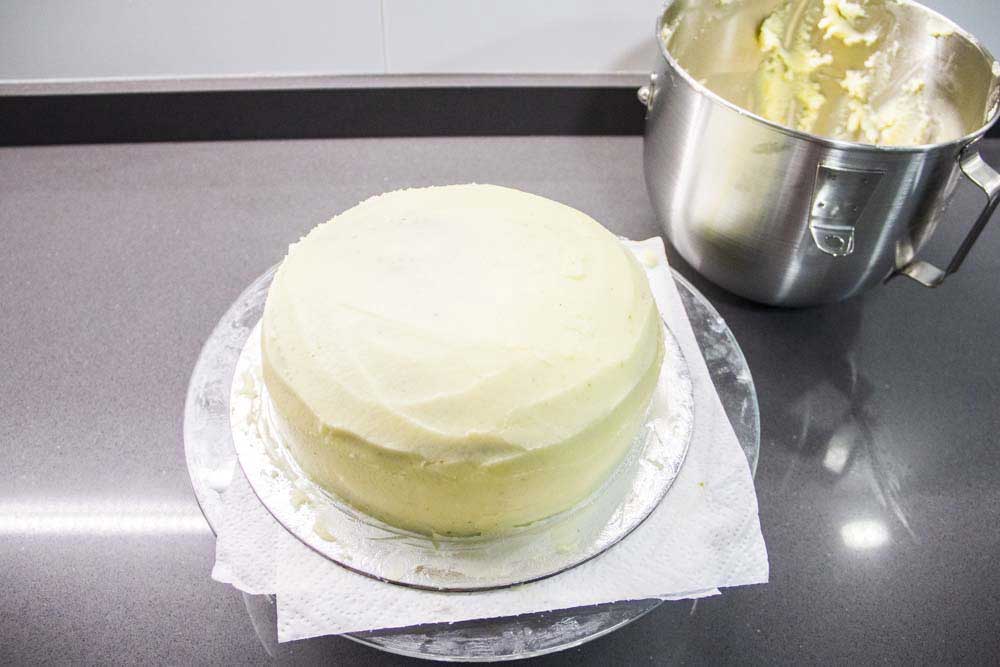 • Repetiremos con el resto de las capas hasta coronar con la última capa y comenzaremos a cubrir la tarta por completo con la espátula y girando la tarta para que la mezcla repartida sea homogénea.