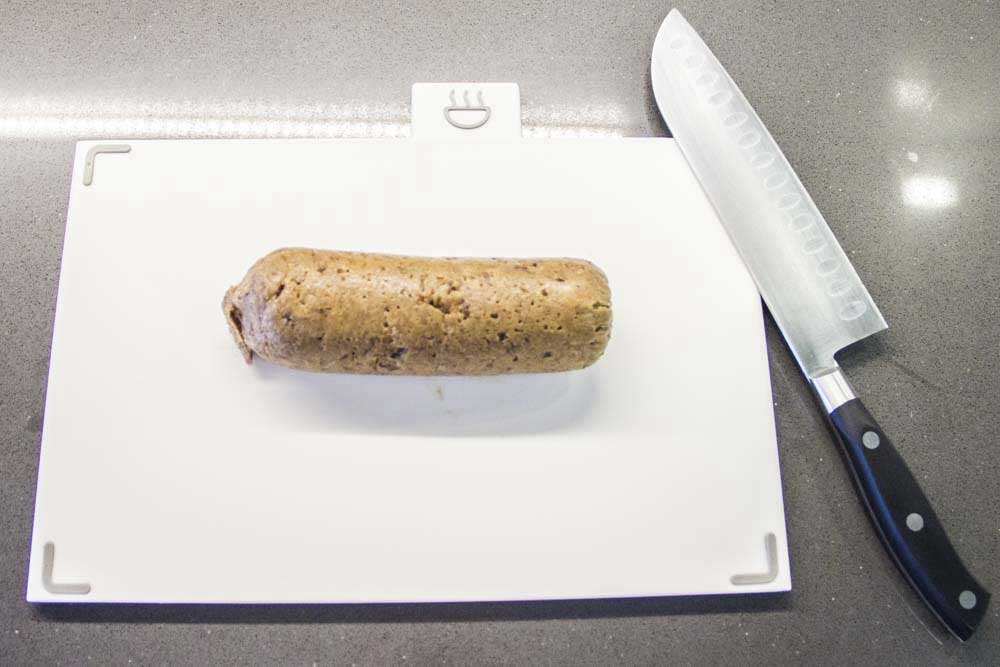 • Una vez fríos en los que haya cogido consistencia el rulo, cortamos por un lado y retiramos el resto de papel film sobre una tabla de cortar y cortamos en discos de unos 3 dedos de grosor.