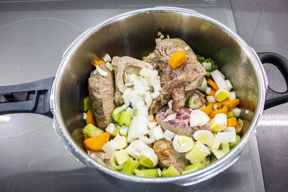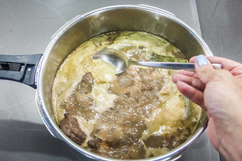 • Dejamos que se cocine a fuego fuerte para retirar la espuma con una cuchara, que son las impurezas que ha ido soltando la carne) y tapamos la olla.