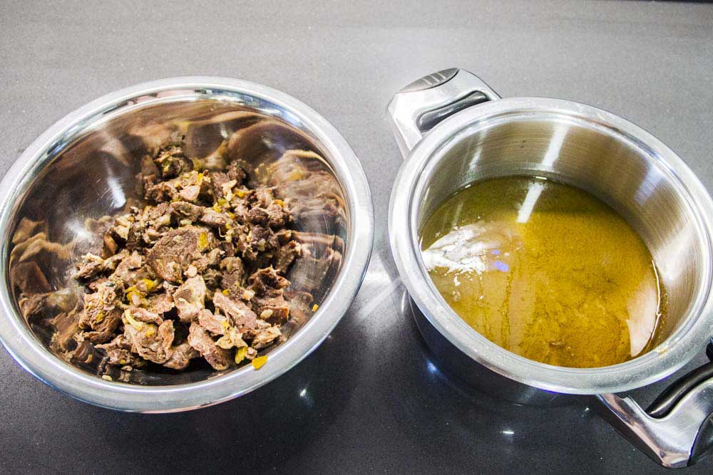 • Colamos el caldo por un chino a una olla más pequeña y reservamos la carne aparte retirando todas la verduras.