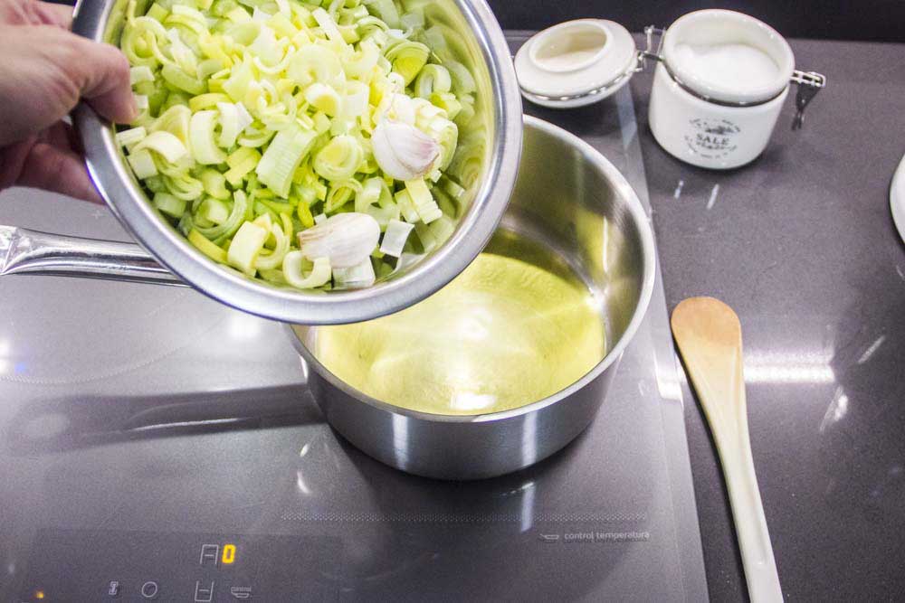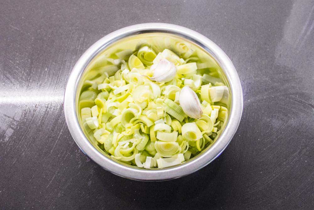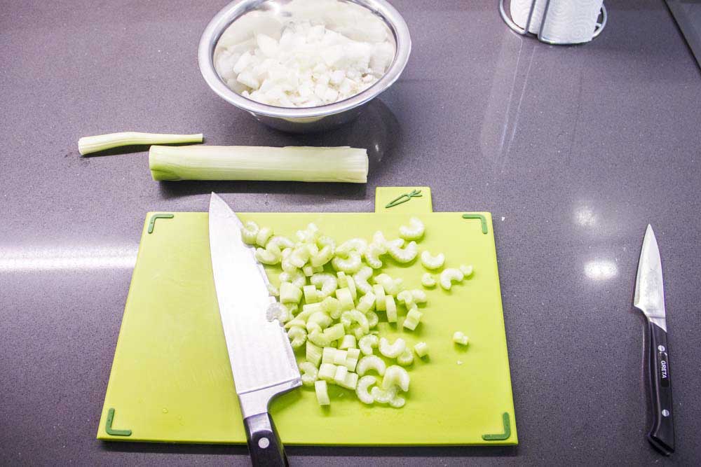- Cortar las verduras (puerro, apio, cebolla) en mirepoix mediana (trocitos medianos)