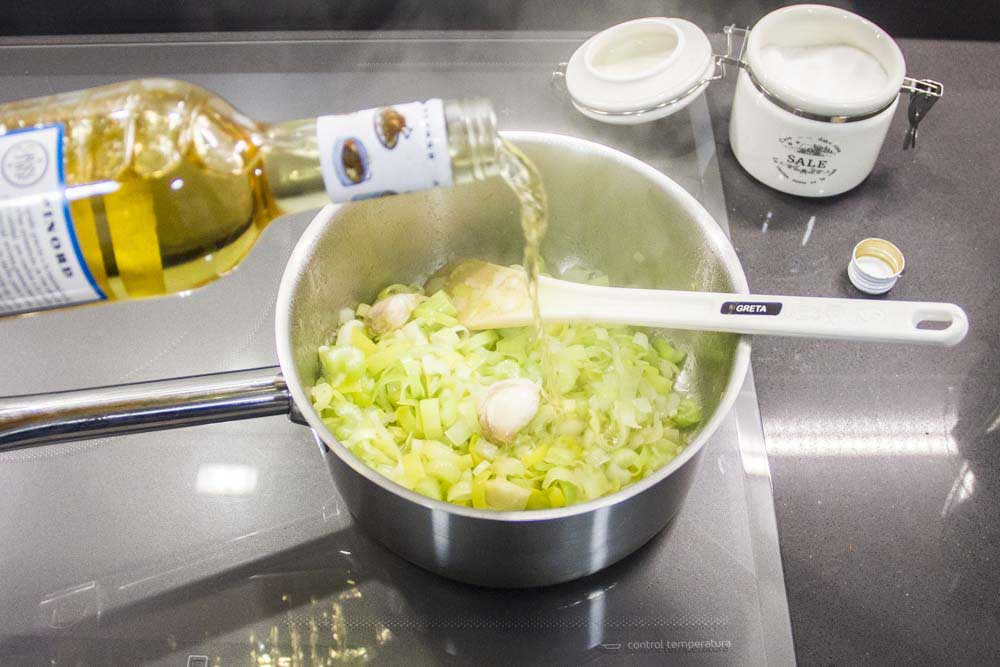- Cuando hayan rehogado las verduras añadimos el vino blanco y esperamos a que se evapore el alcohol.