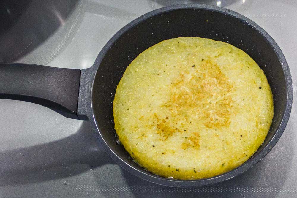- Cuando veamos que se ha dorado un lado le damos la vuelta como si de una tortilla de patata se tratara echando un chirrín de aceite de oliva virgen extra de nuevo y cocinamos el nuevo lado otros siete minutos.